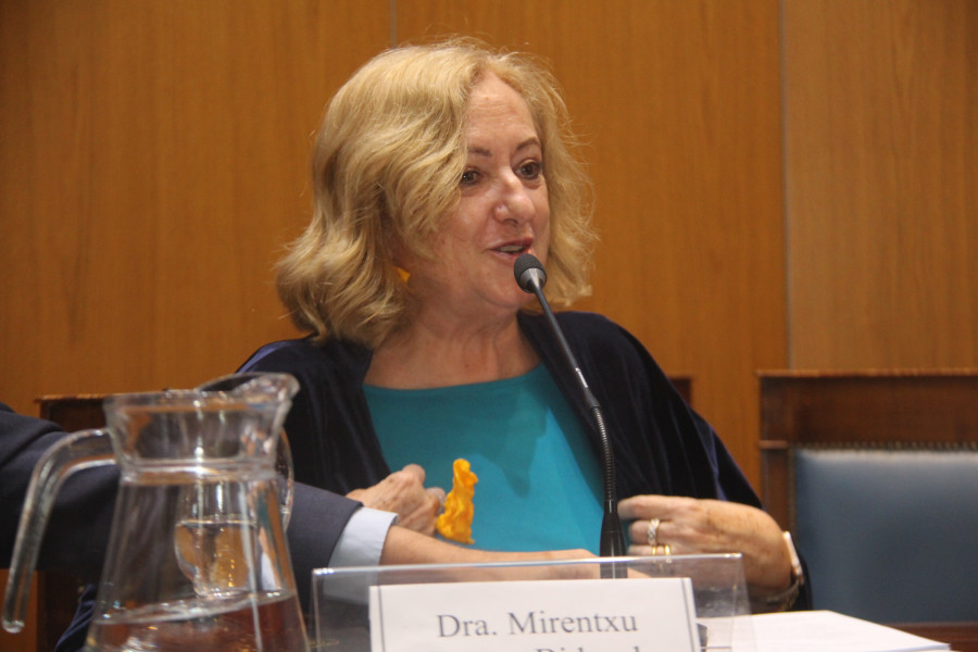 Las palabras introductorias estuvieron a cargo de la vicedecana Silvia Nonna, quien dio la bienvenida a los/as presentes y destacó la labor de Bidasolo tanto en el ámbito académico como en su trayectoria profesional, desarrollada en España y en la Argentina. Subrayó el papel decisivo que tuvo en la formación de futuros penalistas, en particular a través de la maestría organizada por la Universidad de Barcelona, a la que calificó como un verdadero puente académico y humano. Para Nonna, ese trabajo marcó un rumbo y dejó una enseñanza que reflejaron la generosidad y calidez de Bidasolo, cualidades que la acompañaron a lo largo de toda su carrera. En su intervención, Nonna profundizó en los aportes de la homenajeada, entre los cuales mencionó la propuesta de cambios en los planes de estudio que permitieron articular el Derecho Penal con el Derecho Procesal Penal. Esta articulación generó, según explicó, una enseñanza más dinámica, activa e inclusiva para los estudiantes, consolidando un modo de enseñanza que respondía mejor a las necesidades académicas y profesionales. En ese marco, también resaltó el compromiso constante de Bidasolo con la universidad pública. “En este momento, para nosotros, es algo muy importante, y agradezco a Bidasolo por el apoyo en estos tiempos difíciles”, expresó. Asimismo, se refirió al vínculo entre la UBA y la Universidad de Barcelona, instituciones unidas por convicciones comunes, en especial, la defensa del carácter público de la universidad. Según sus palabras, conferir este honor a Mirentxu era también una forma de reforzar ese lazo fecundo y la historia compartida entre ambas instituciones.