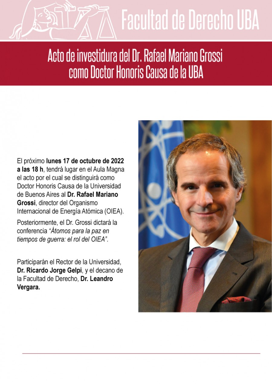 El lunes 17 de octubre de 2022 a las 18 h, tendrá lugar en el Aula Magna el acto por el cual se distinguirá como Doctor Honoris Causa de la Universidad de Buenos Aires al Dr. Rafael Mariano Grossi, quien actualmente es Director del Organismo Internacional de Energía Atómica (OIEA). Posterior al acto, el Dr. Grossi realizará una disertación bajo el título “Átomos para la paz en tiempos de guerra: el rol del OIEA”.