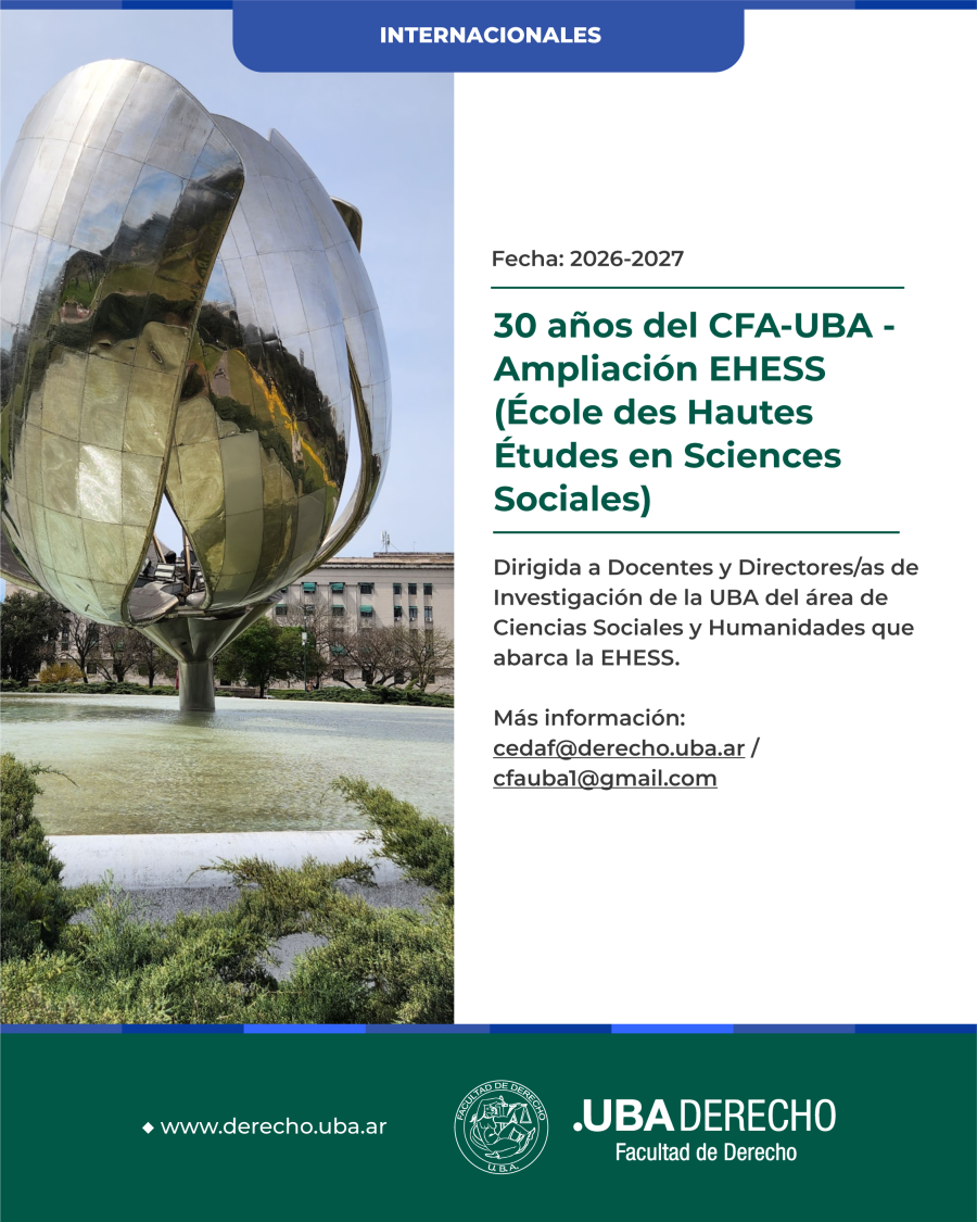 En esta Convocatoria 2026 “30 años del CFA-UBA - ampliación” se extiende a fin de promover la invitación de docentes-investigadores/as de la UBA a la EHESS (École des Hautes Études en Sciences Sociales) para la realización de estancias cortas.En esta primera oportunidad se suma la oferta de la convocatoria tradicional 1 plaza para un/a docente de la UBA con el fin de realizar una estancia académica corta en la EHESS (máximo 1 mes de duración).
